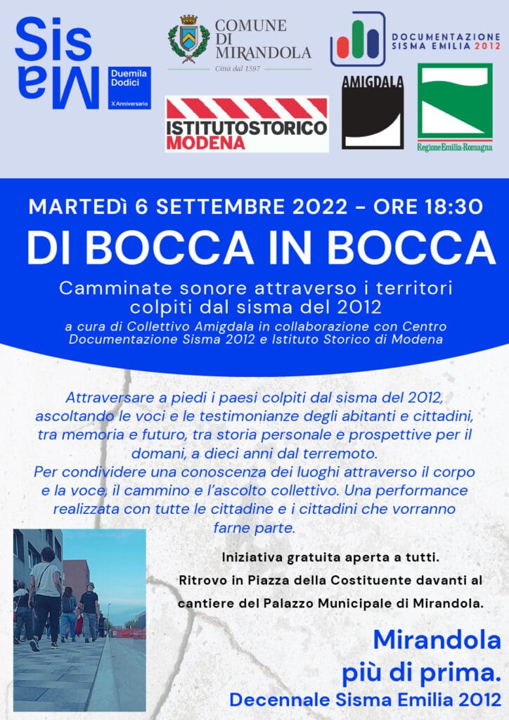 Nel programma “Mirandola più di prima – Decennale Sisma Emilia 2012” è prevista l’iniziativa “Di bocca in bocca”, una camminata sonora gratuita e aperta a tutta la cittadinanza. L’appuntamento è martedì 6 settembre 2022 alle ore 18.30, con ritrovo in Piazza della Costituente, davanti al cantiere del Palazzo Municipale di Mirandola. La proposta, a cura di Collettivo Amigdala in collaborazione con Centro Documentazione Sisma Emilia 2012 e Istituto Storico di Modena, invita ad attraversare a piedi i luoghi colpiti dal terremoto del 2012 ascoltando voci, testimonianze e racconti di abitanti e cittadini: un percorso tra memoria e futuro, tra storia personale e prospettive per il domani, a dieci anni dal sisma. L’esperienza valorizza la conoscenza dei luoghi attraverso il corpo, il cammino e l’ascolto collettivo, configurandosi come una performance che coinvolge chiunque desideri prenderne parte.