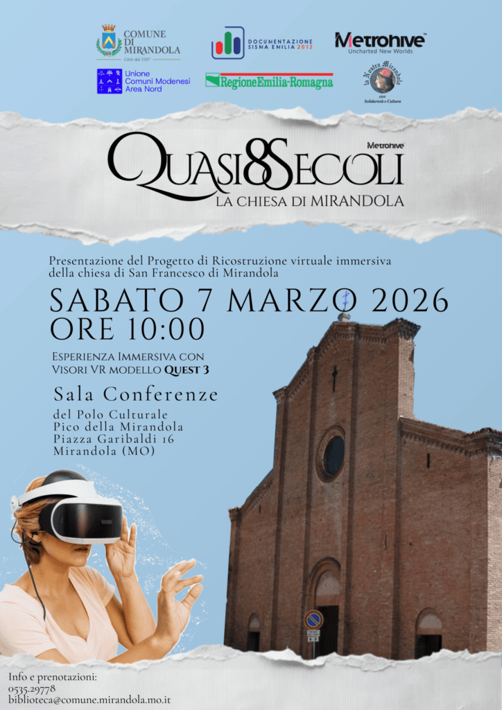 Con riferimento alle attività del Centro Documentazione Sisma , si inoltra l'invito a partecipare all'evento "Quasi 8 Secoli. La Chiesa di Mirandola" ovvero la presentazione pubblica del progetto di ricostruzione storica virtuale della Chiesa di San Francesco da visualizzare con visori digitali.
