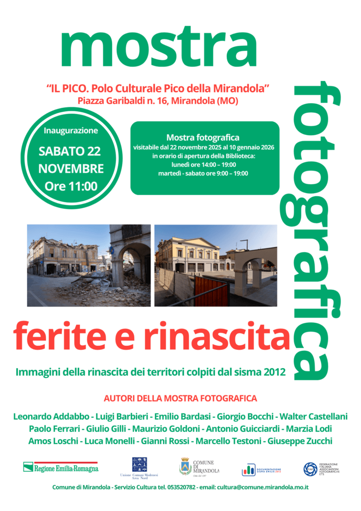 Presso “Il Pico. Polo Culturale Pico della Mirandola” è allestita la mostra fotografica “Ferite e rinascita”, un progetto che affianca immagini scattate nel 2012, subito dopo il terremoto, a nuove fotografie realizzate oggi, a 13 anni di distanza.