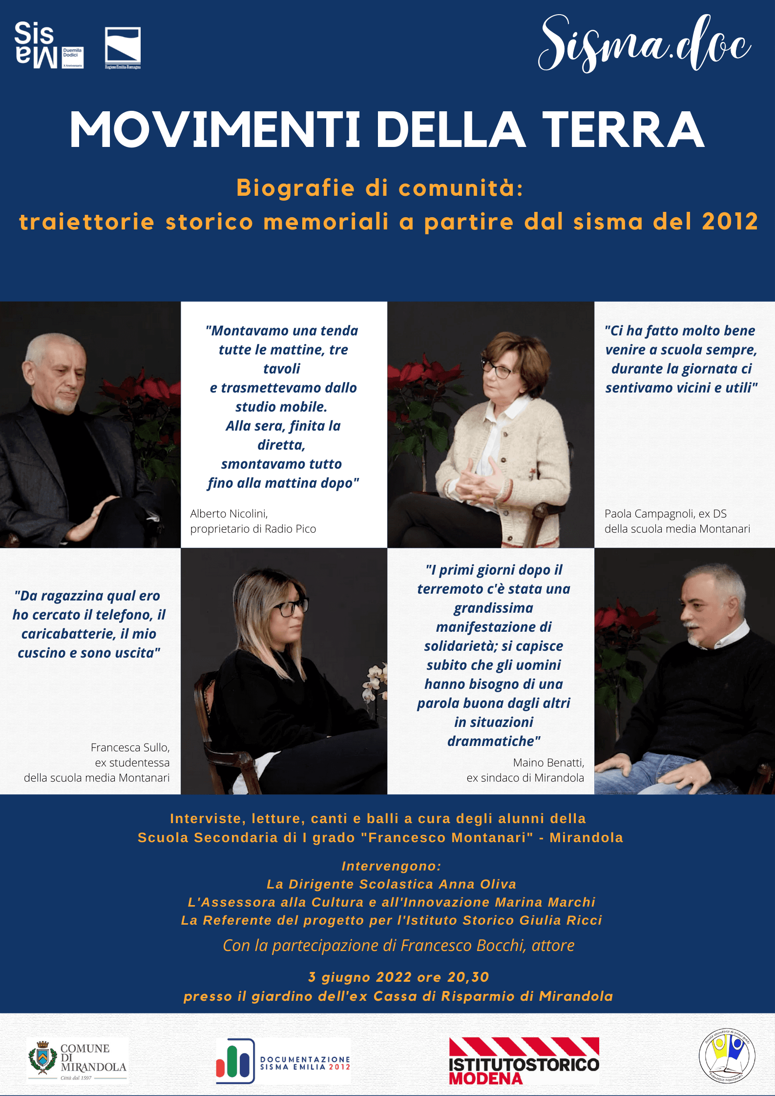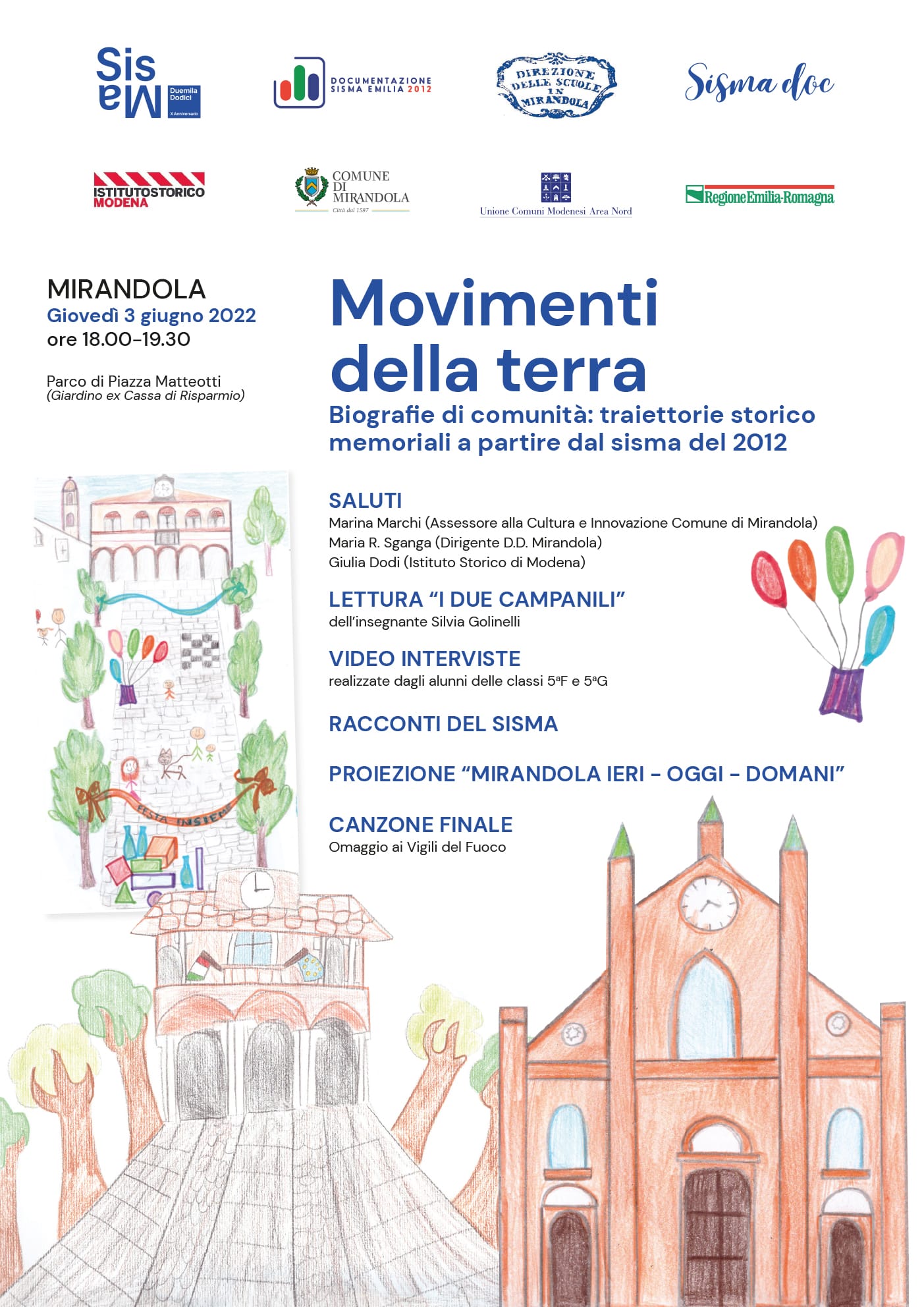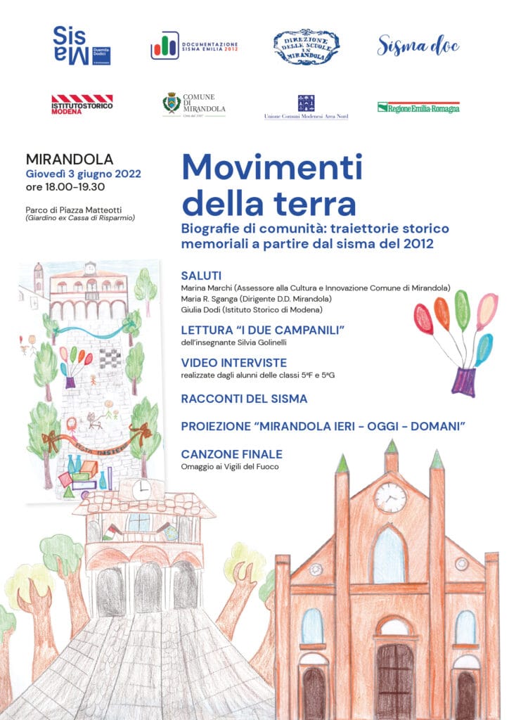A Mirandola è in programma “Movimenti della terra – Biografie di comunità: traiettorie storico-memoriali a partire dal sisma del 2012”, un evento unico che si articola in due momenti consecutivi, pensati per pubblici diversi. La prima parte (ore 18.00–19.30) è rivolta in particolare a bambini e famiglie e propone saluti istituzionali, la lettura “I due campanili”, video-interviste realizzate dagli alunni delle classi quinte, racconti del sisma, la proiezione “Mirandola ieri – oggi – domani” e una canzone finale con omaggio ai Vigili del Fuoco. La seconda parte (ore 20.30) è dedicata principalmente a un pubblico adulto e presenta interviste, letture, canti e balli a cura degli alunni della Scuola Secondaria di I grado “Francesco Montanari”, con interventi della Dirigente scolastica, dell’Assessorato e della referente del progetto, e la partecipazione di un attore. L’iniziativa si svolge giovedì 3 giugno 2022 presso il Parco di Piazza Matteotti (Giardino ex Cassa di Risparmio).